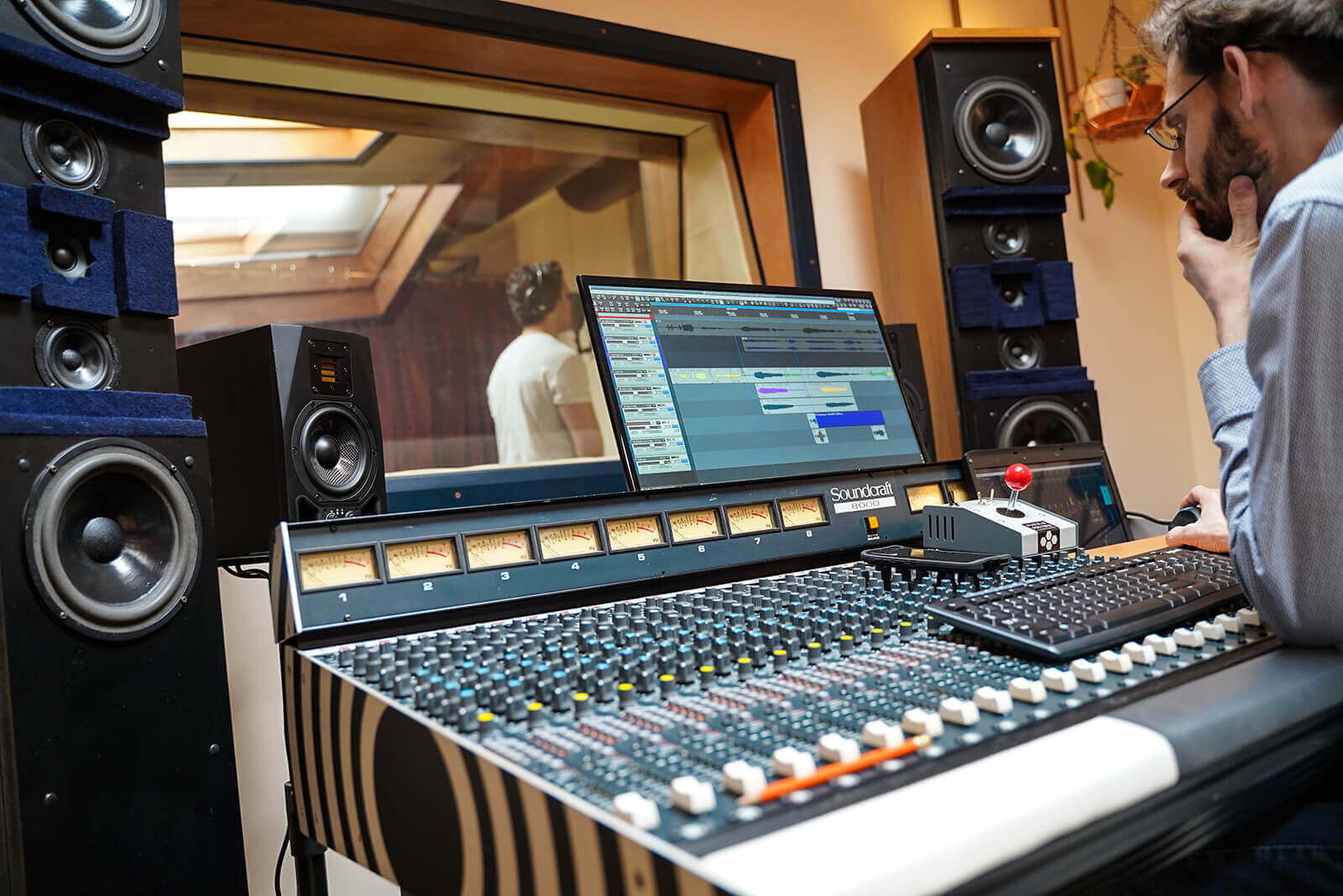 Control Room Two is our main recording studio, the best of vintage and modern. It sounds great thanks to the vintage Soundcraft 8000 analogue recording console, wide range of boutique preamps & microphones, and our full-range Duntech Marquis main monitors. At 4.7 x 4.5 metres it's spacious enough for several musicians with perfect line-of-sight into Live Room A maintained all the way through to Live Room B. The retro stylings create a comfortable, creative working environment.